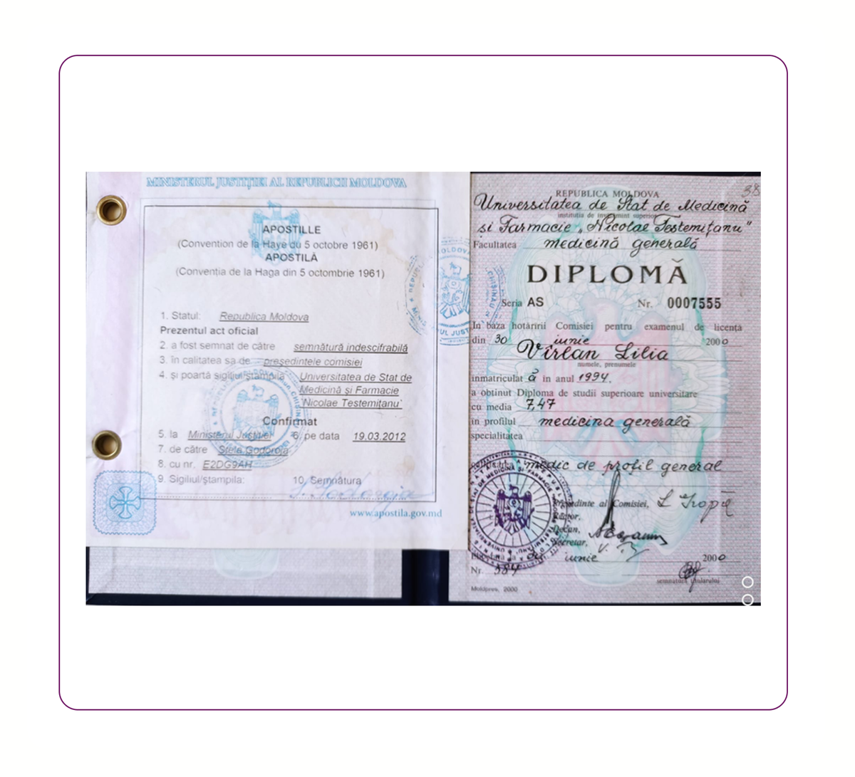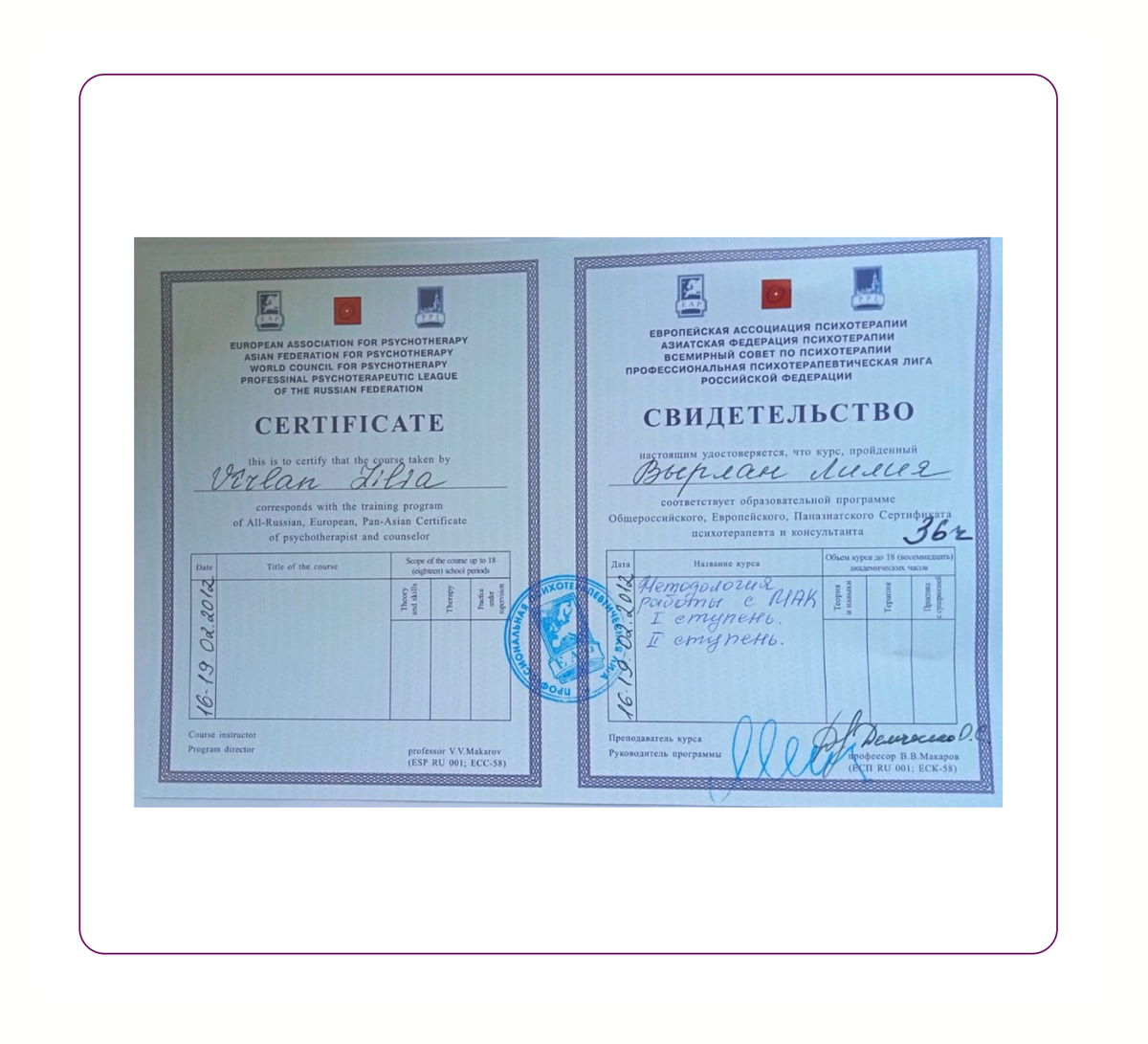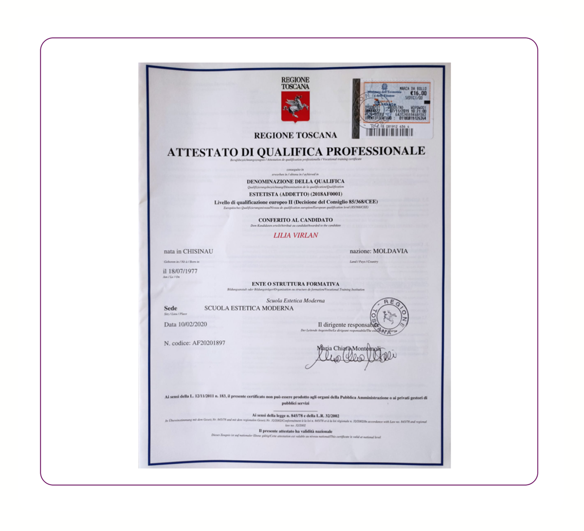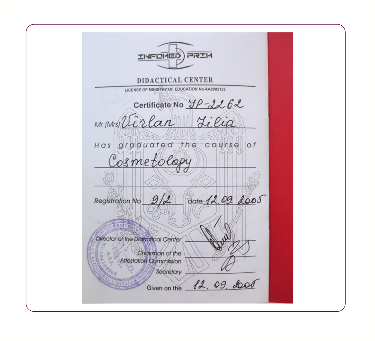 - Диплом "Европейской международной школы повышения квалификации по эстетической косметологии". Тоскана, Италия
