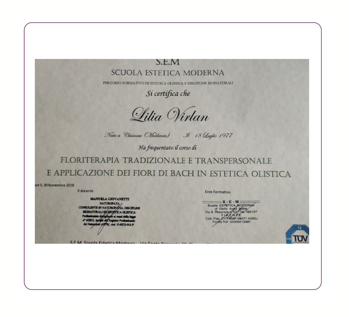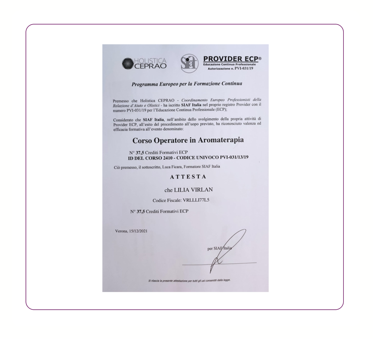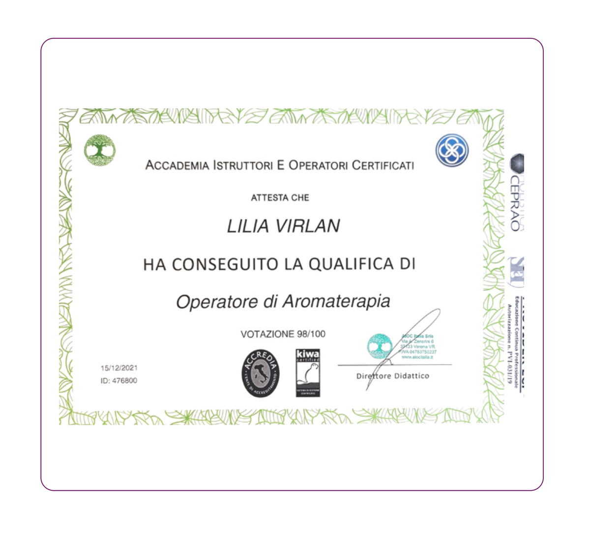 - Дипломированный ароматерапевт и фитотерапевт "Европейской академии ароматерапии". Рим, Италия